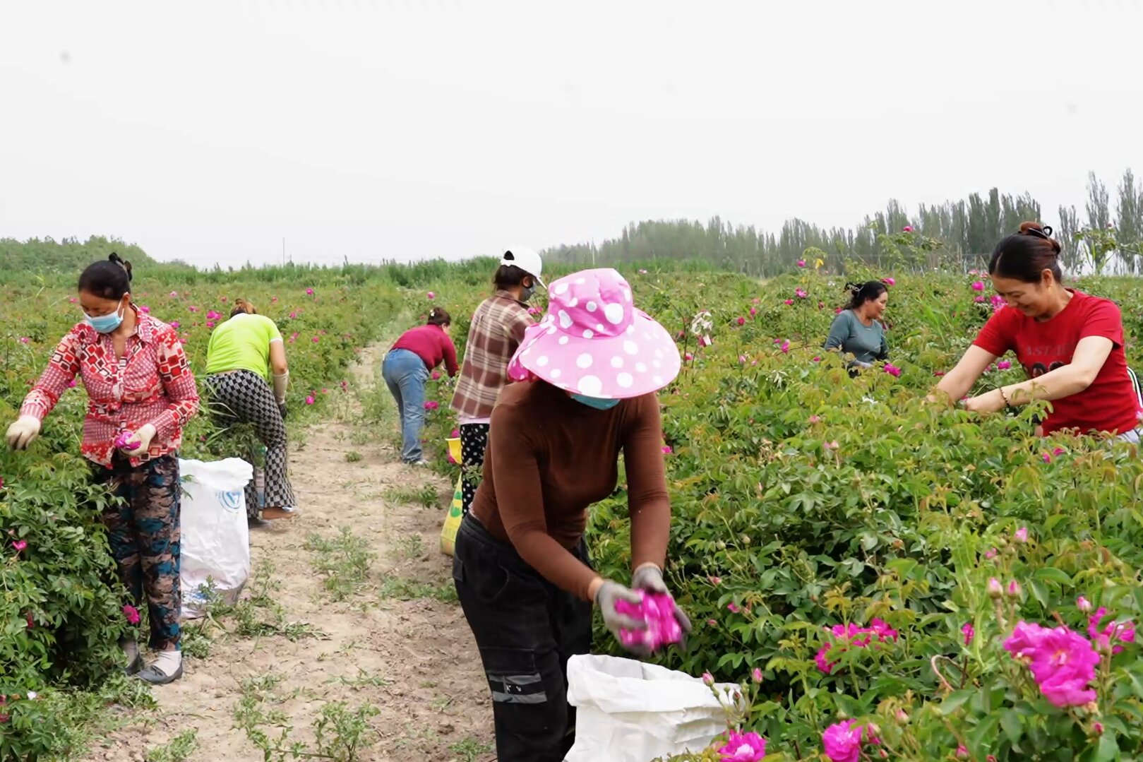 新和县塔木托格拉克乡乔拉克吐尔村“两委”联合县市场监督管理局驻村工作队,组织村干部、工作队员、无职党员共10人,帮助村内缺少劳动力的种植户采摘玫瑰花20余亩,助力花经济富民增收。