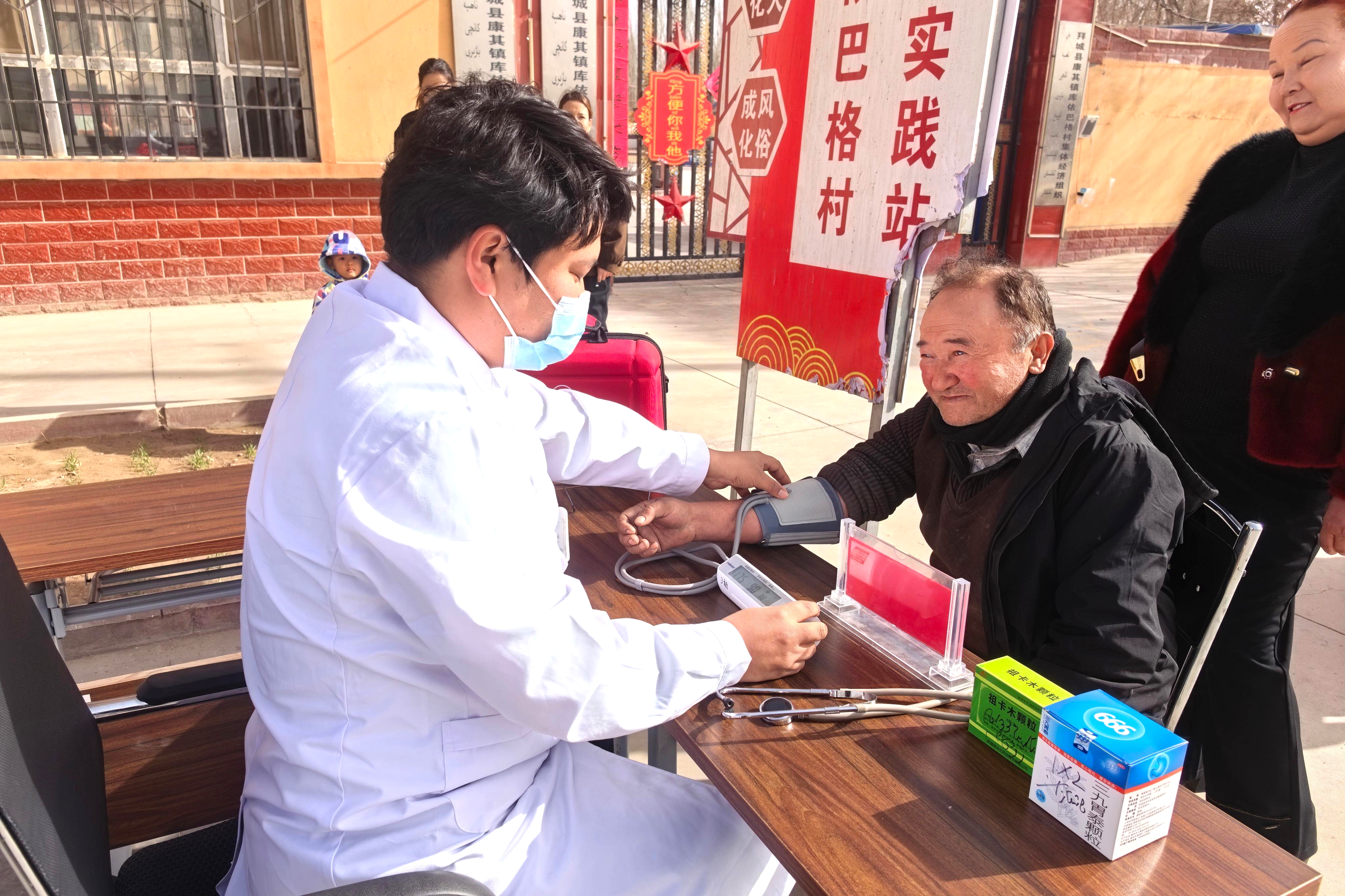 拜城县财政局驻康其镇库依巴格村工作队邀请乡卫生院医护人员开展爱心义诊,为村民提供健康咨询、测量血压、常见病诊疗等服务,讲解日常保健知识,解答群众疑问,以实际行动办实事、解难题。