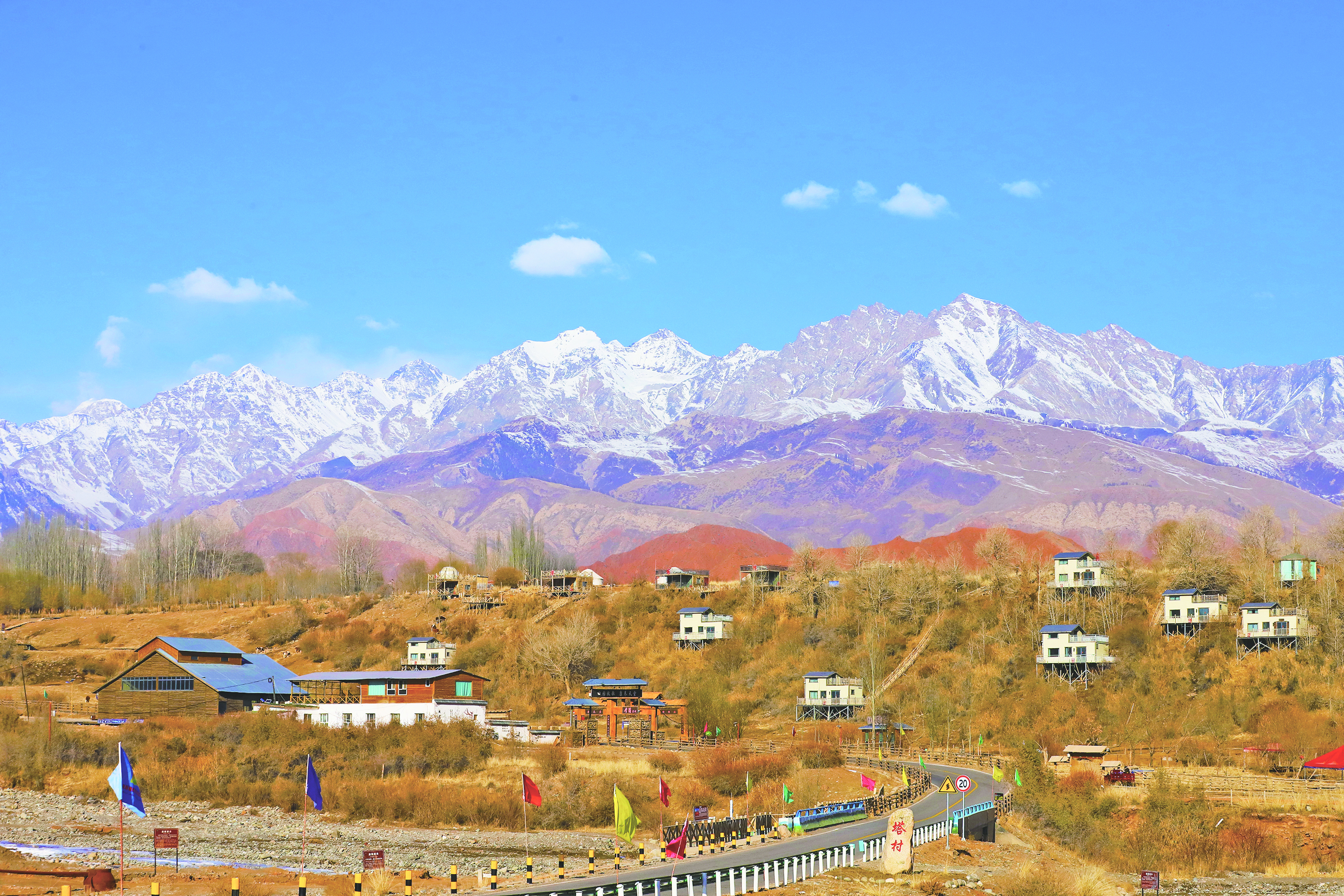 十一月二十三日,天山托木尔景区塔村景色优美,雪山与丹霞地貌交织成一幅瑰丽画卷,山脚下的特色民宿错落分布,点缀其间。 通讯员 王举南 摄