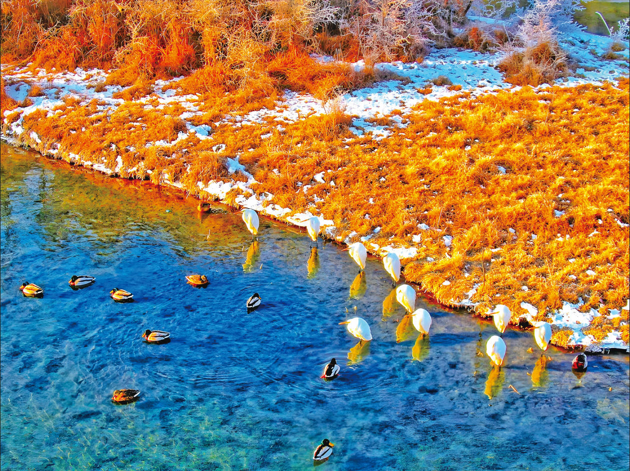 近日,乌什县奥特贝希乡湿地生机盎然,成群白鹭在浅滩处静立,麻鸭、鸳鸯时而嬉戏水中,时而栖于芦苇丛中,与碧水晴空相映成趣,构成一幅和谐的生态图景。 通讯员 张鹤 摄