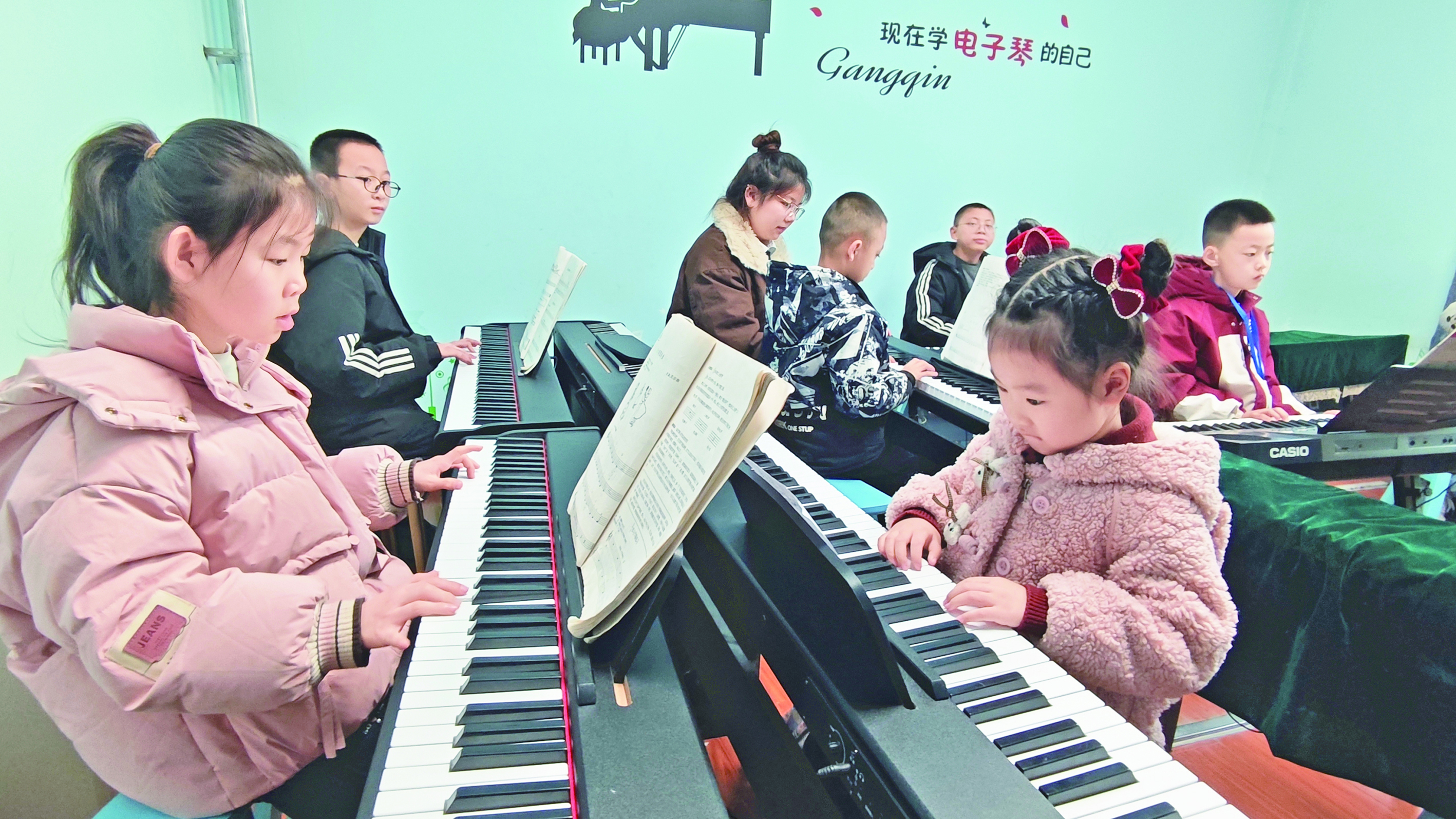 2月2日,在阿瓦提县青少年活动中心,孩子们正在学习弹电子琴。 通讯员 包良廷 摄