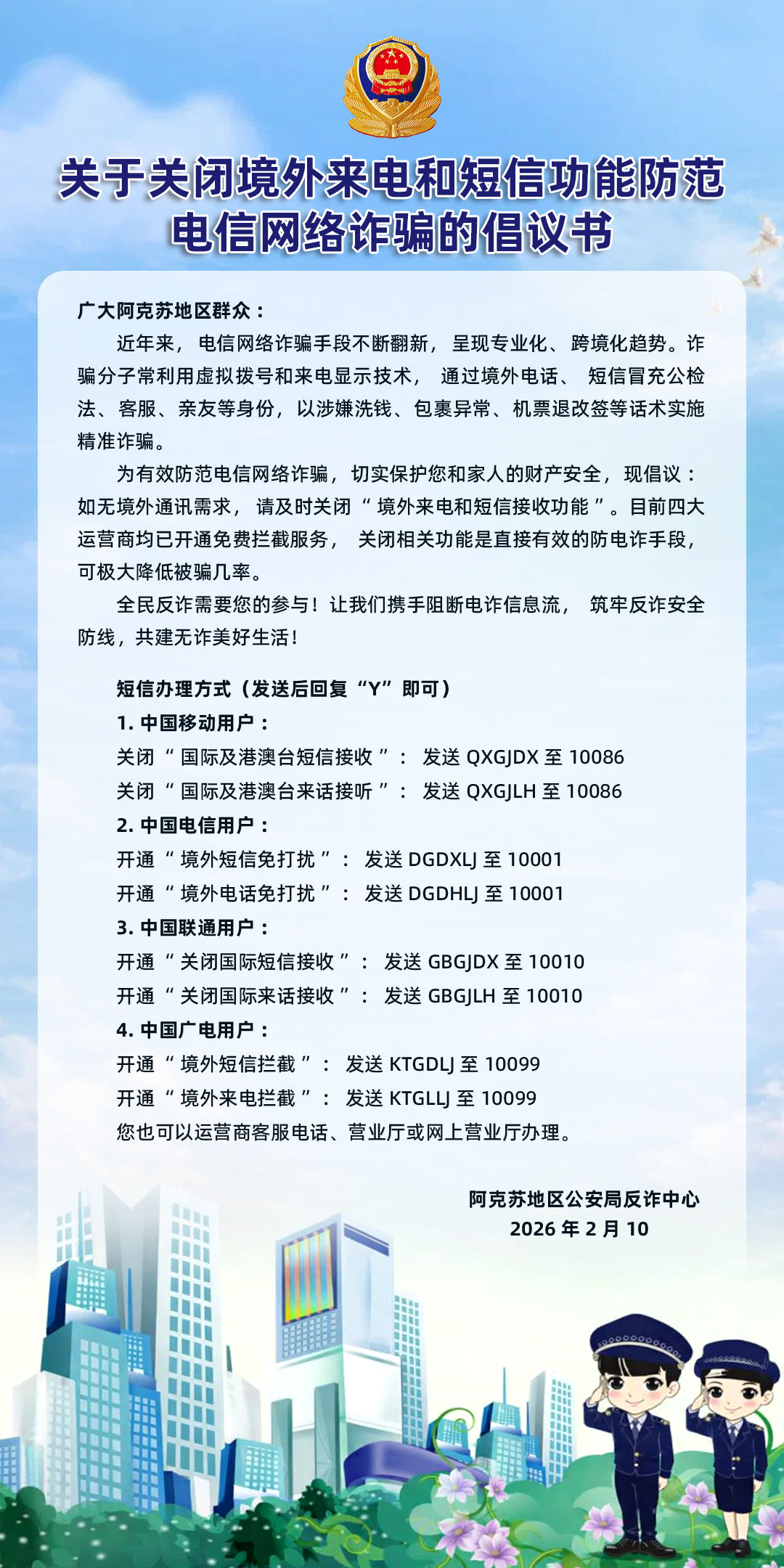 关于关闭境外来电和短信功能防范电信网络诈骗的倡议书