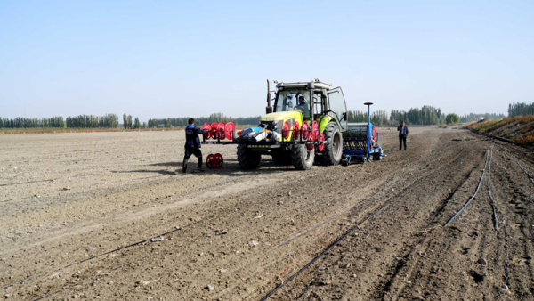 温宿县农民驾驶装载北斗导航系统的播种机播种小麦(资料图)