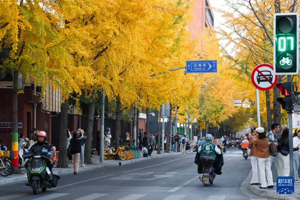 11月30日,人们在浙江省杭州市环城北路一处位于银杏间的自动扶梯上打卡拍照。新华社发(庄颖昶摄)