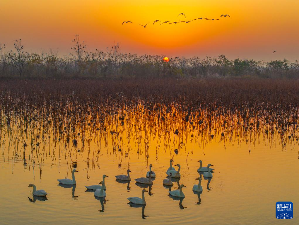 11月30日,群鸟在江苏兴化里下河国家湿地公园内栖息、觅食(无人机照片)。新华社发(周社根摄)