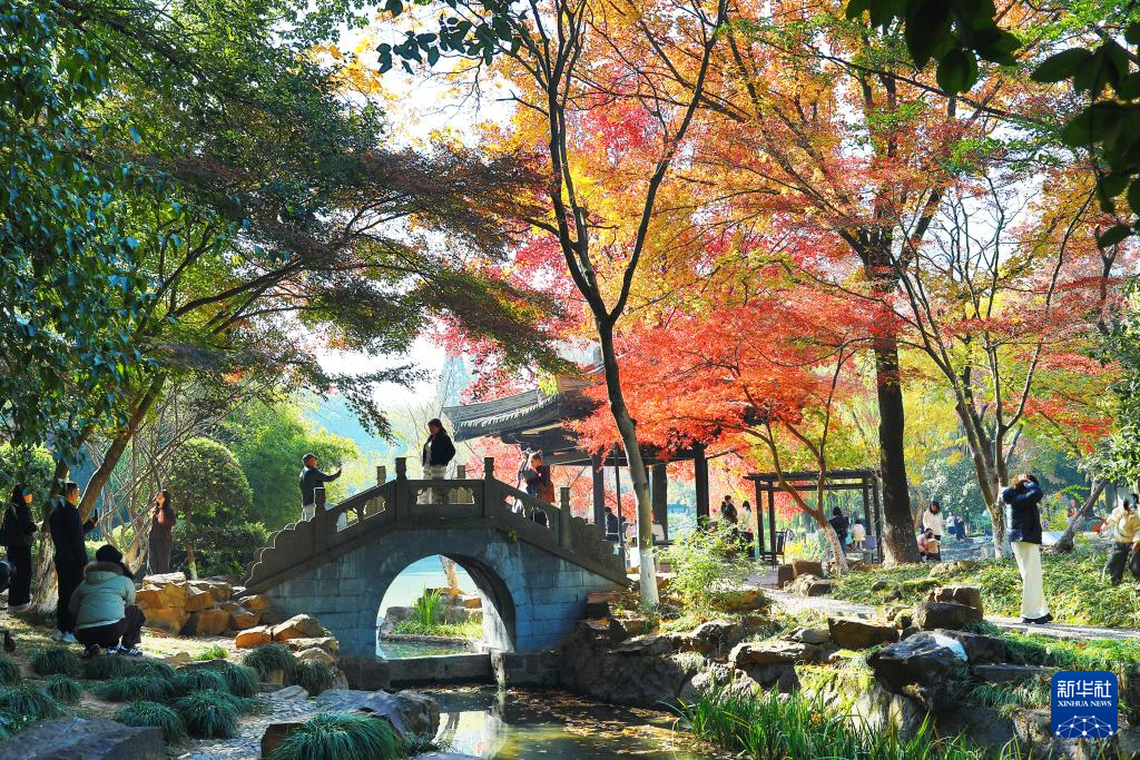 12月8日,游客在浙江省嘉兴市南湖景区湖心岛观赏枫叶。新华社发(金鹏摄)
