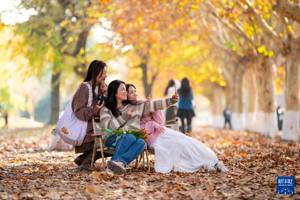12月7日,游客在江苏泰州医药城梧桐大道打卡拍照。新华社发(汤德宏摄)