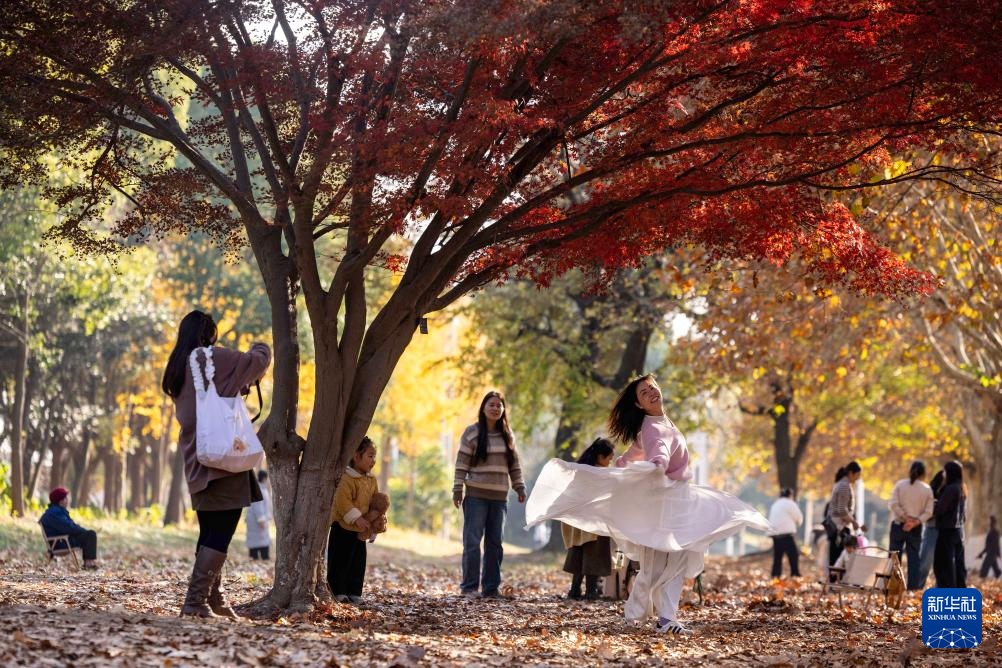 12月7日,游人在江苏南京中山植物园观赏枫叶。新华社发(杨素平摄)
