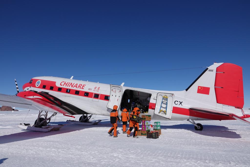 2015年11月30日,一架红白相间的固定翼飞机降落在南极中山站附近的冰盖机场,尾翼上的五星红旗格外醒目。