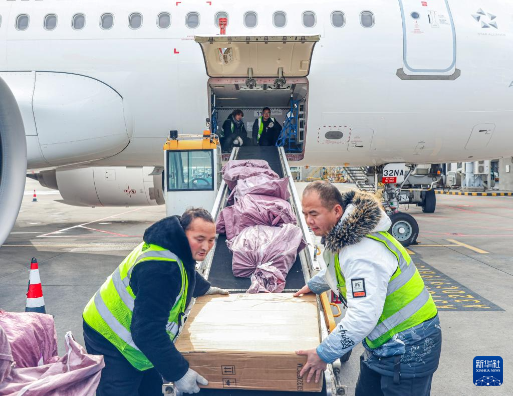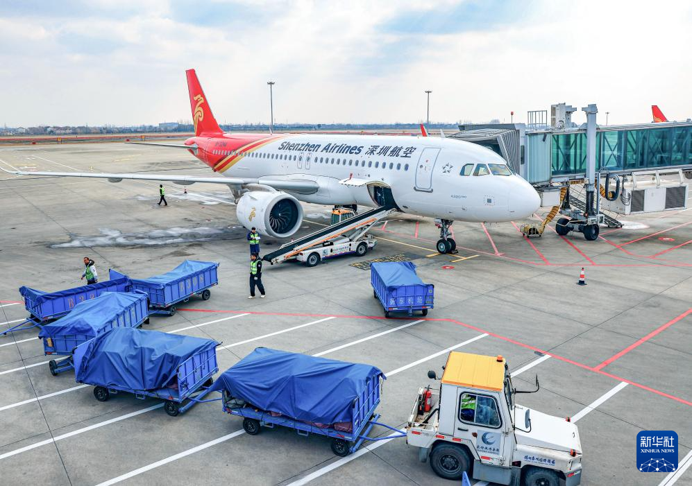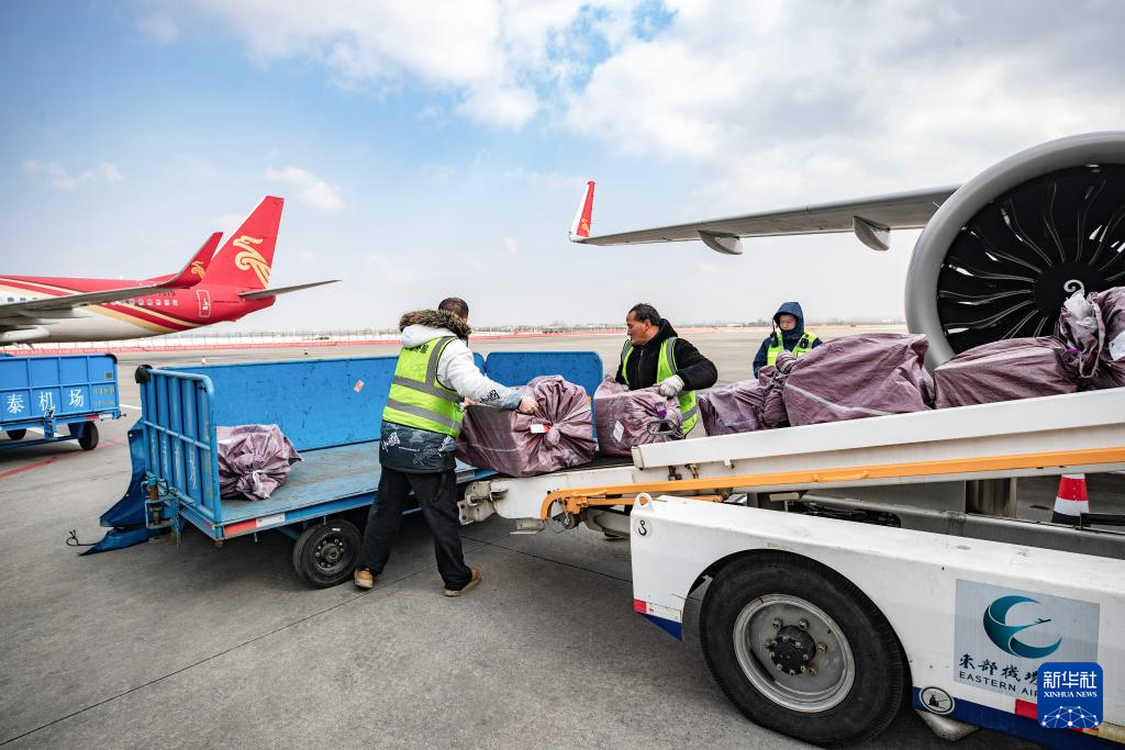 1月28日,装卸人员在扬州泰州国际机场装卸货物。新华社发(任飞摄)