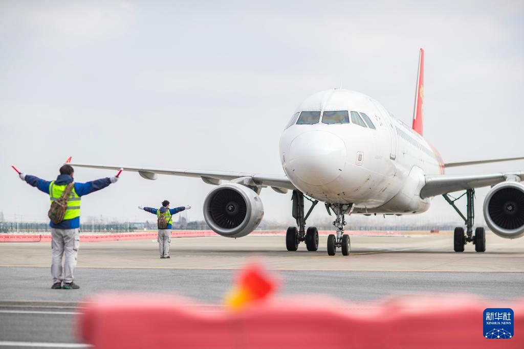 1月28日,机务人员在扬州泰州国际机场停机坪引导飞机停靠到指定停机位。新华社发(周社根摄)