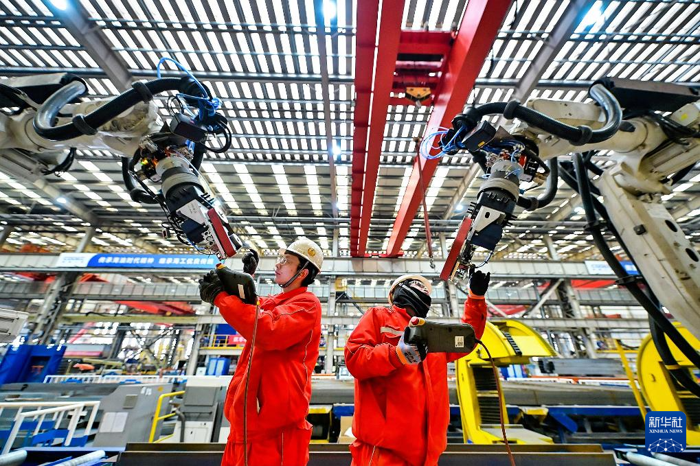 1月29日,在天津市滨海新区,海上油气平台建设工人操作打磨机器人。新华社发(杜鹏辉摄)