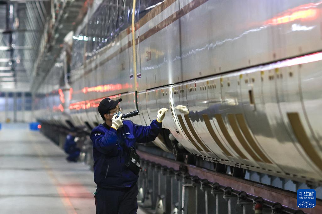 1月28日凌晨,工作人员在南京南动车运用所检修动车组列车。新华社发(杨素平 摄)