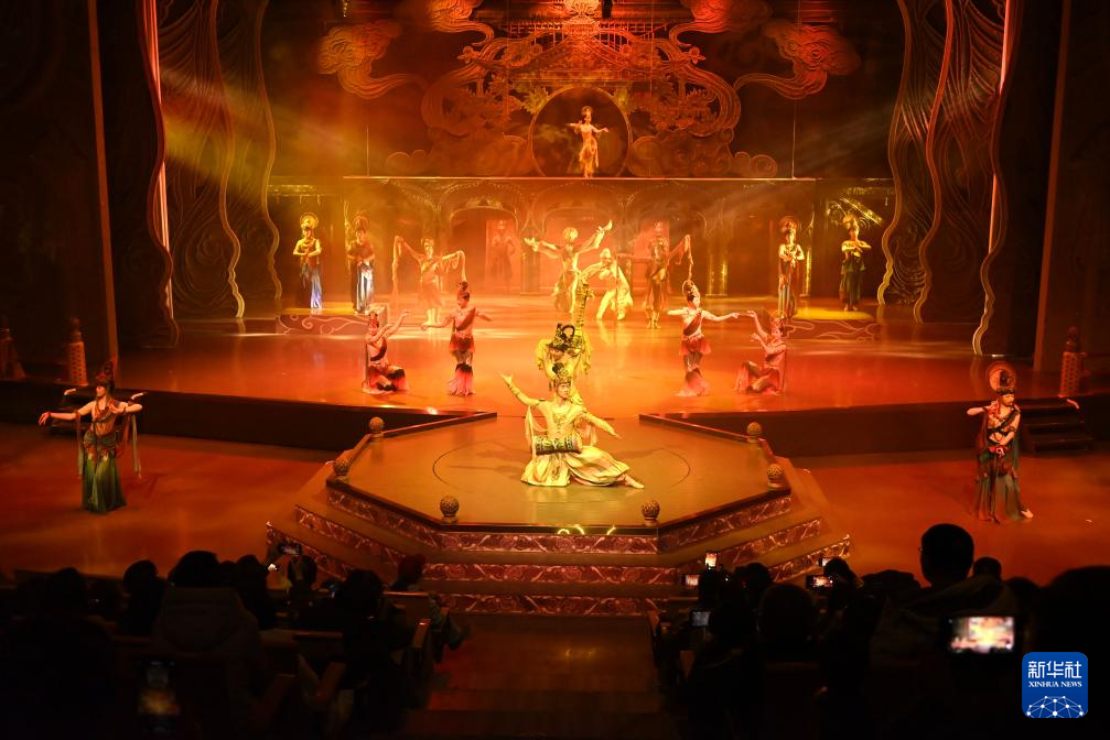 1月9日晚,游客观看大型洞窟沉浸式体验剧《乐动敦煌》。新华社发(张晓亮 摄)