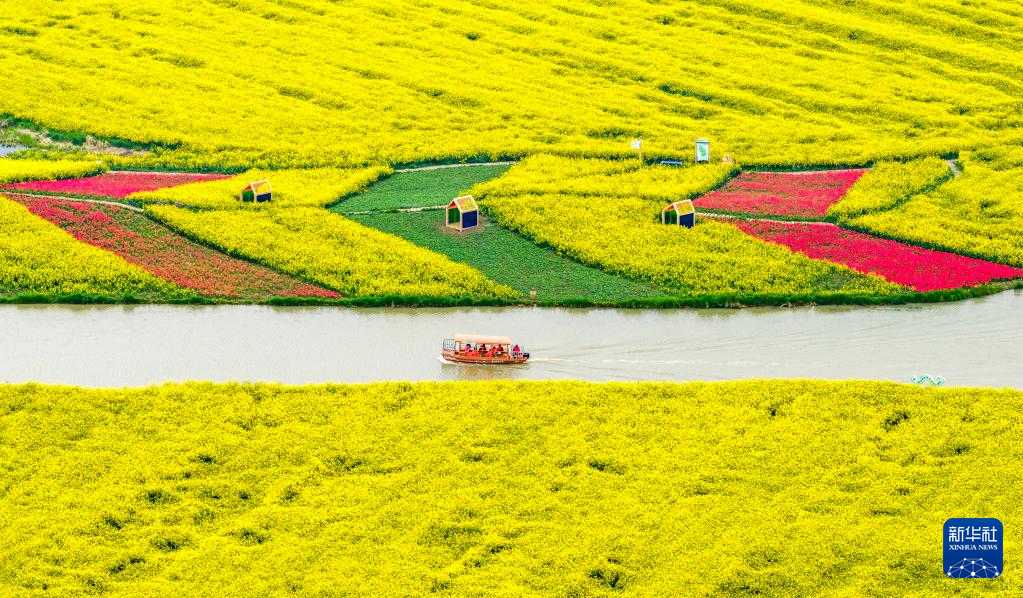 4月4日,游客在江苏省高邮市湖上花海景区乘船游玩(无人机照片)。新华社发(周社根摄)
