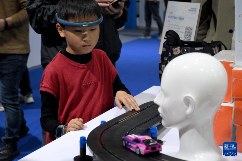 4月26日,小朋友在第四届中国(安徽)科技创新成果转化交易会上体验一款脑控赛车。新华社记者 黄博涵 摄