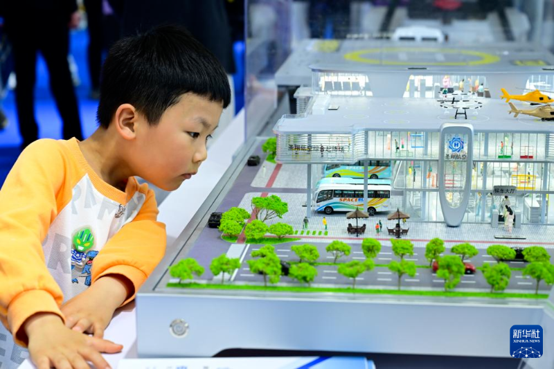 4月26日,小朋友在第四届中国(安徽)科技创新成果转化交易会上观看一款低空枢纽起降场模型。新华社记者 周牧 摄