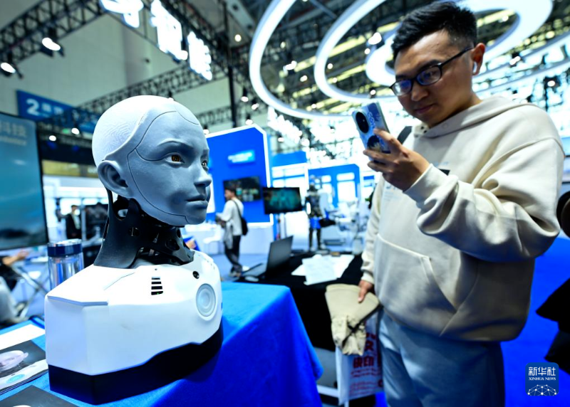 4月26日,观众在第四届中国(安徽)科技创新成果转化交易会上和一款人形机器人互动。新华社记者 周牧 摄