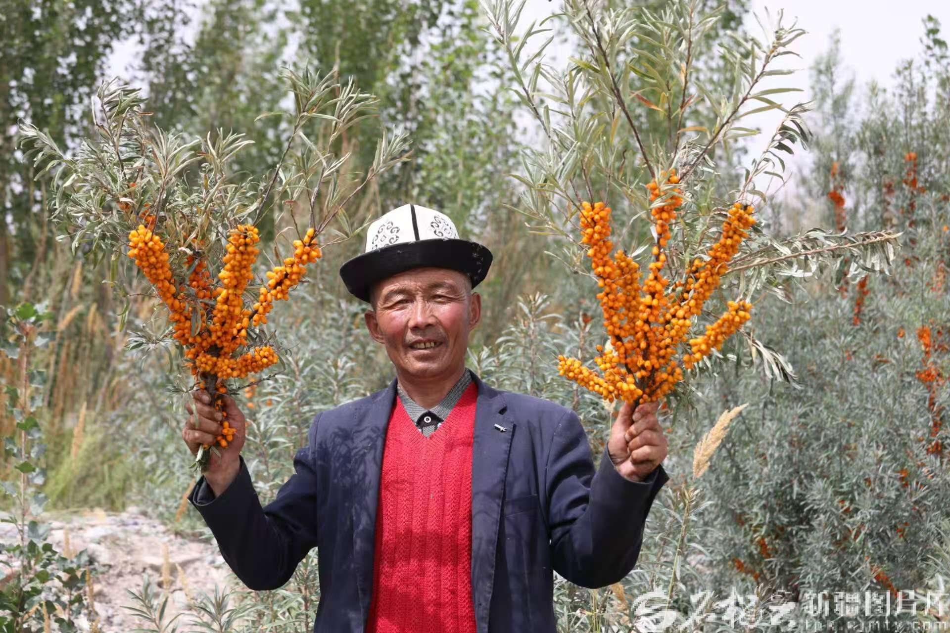 “早些年这里是光秃秃的戈壁滩,风一吹沙子能打疼脸,现在每棵树都能结8到12公斤沙棘果。”11月15日,护林员艾山江·吾守尔在沙棘林里边修剪枝条边说。
