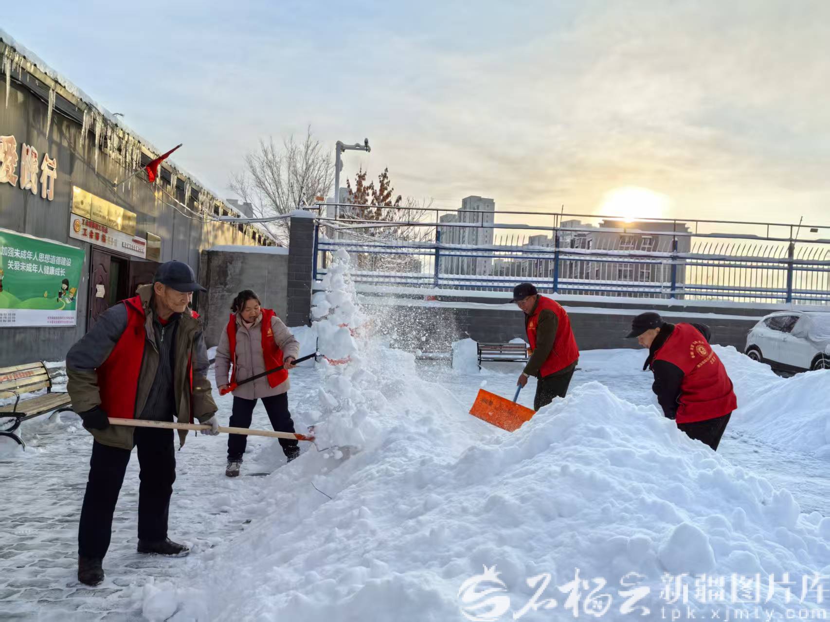 12月11日,乌鲁木齐市米东区米东南路街道小水渠社区志愿服务队的志愿者们在帮助社区清雪。何珍珍摄