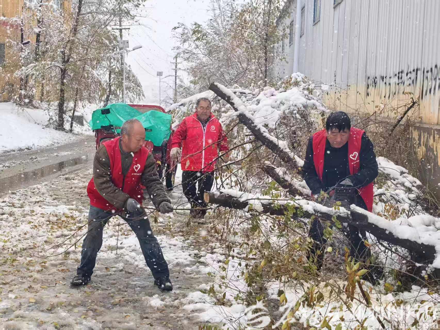 12月11日,乌鲁木齐市米东区古牧地镇大草滩村志愿服务队的志愿者们清理被积雪压断的树枝。方锦怡摄