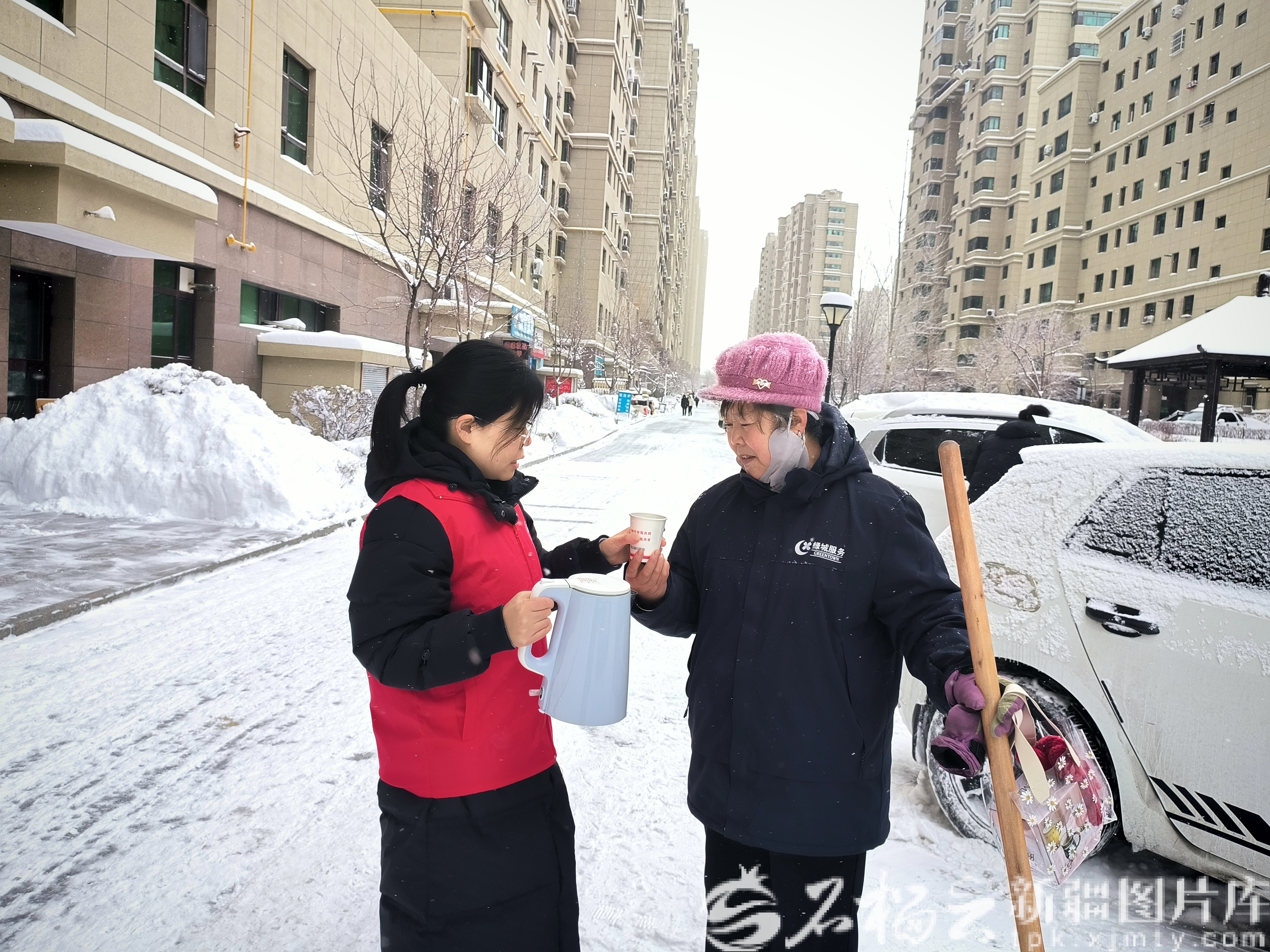 12月11日,乌鲁木齐经济技术开发区(头屯河区)西湖街道东山坡社区志愿者为清雪人员送上姜茶和“暖心礼包”。刘超楠摄