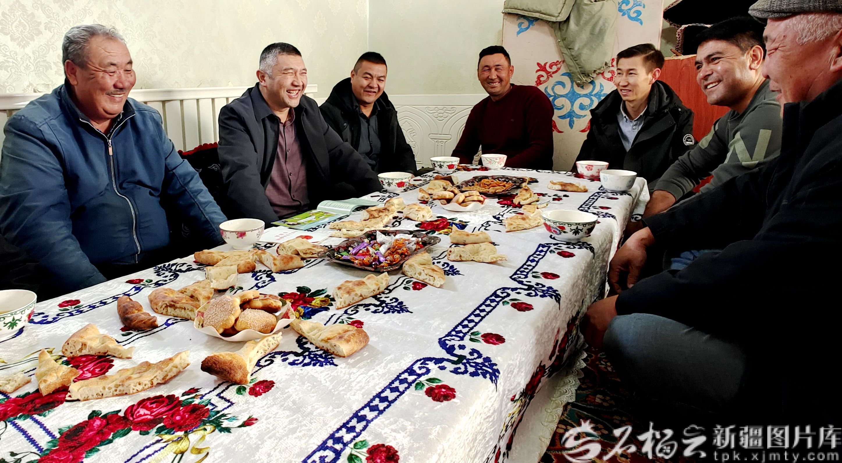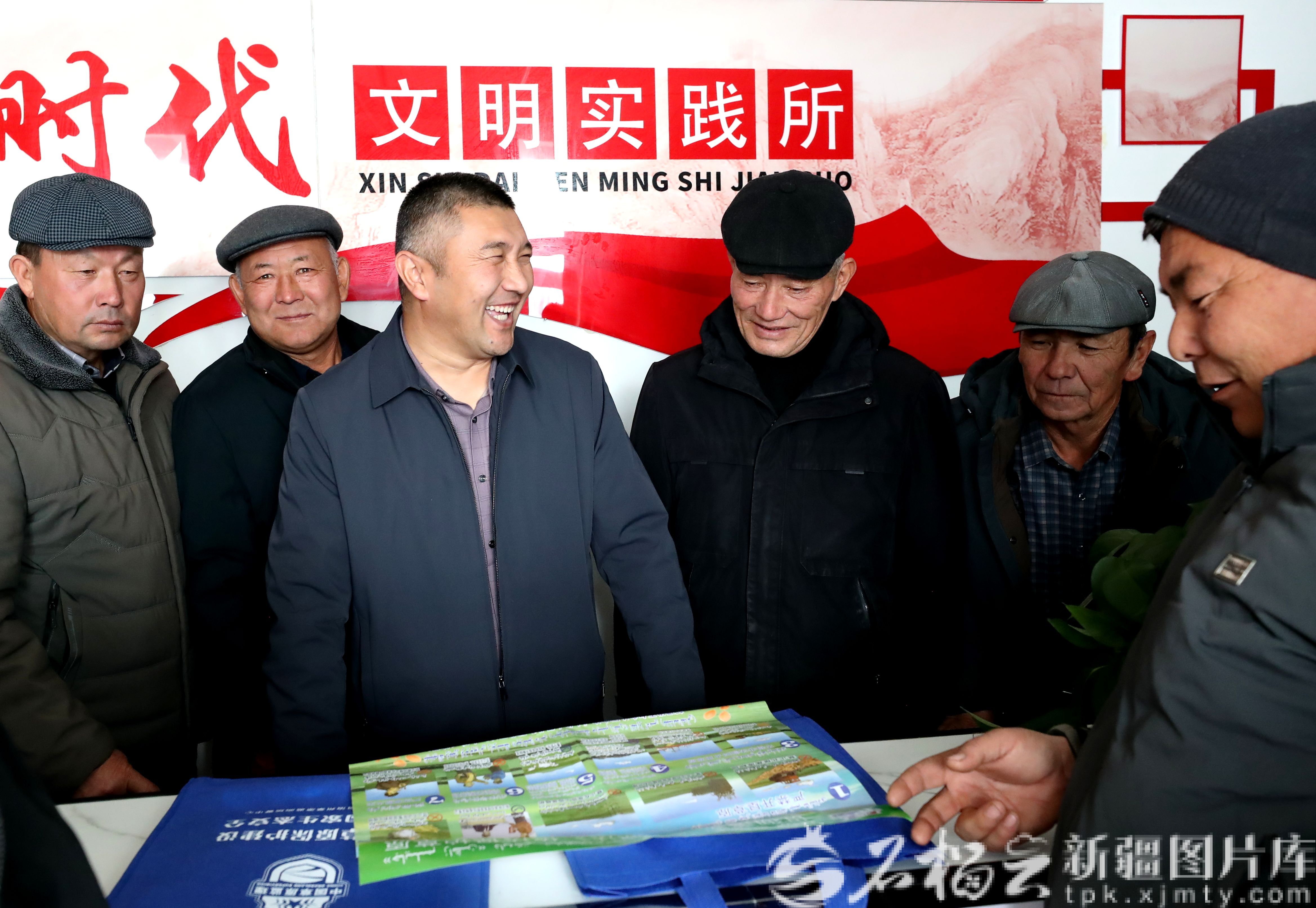 12月13日,在巩留县塔斯托别乡,阿曼太·斯勒肯别克(左三)利用草原监测图向牧民普及生态保护知识,引导牧民守护草原生态。