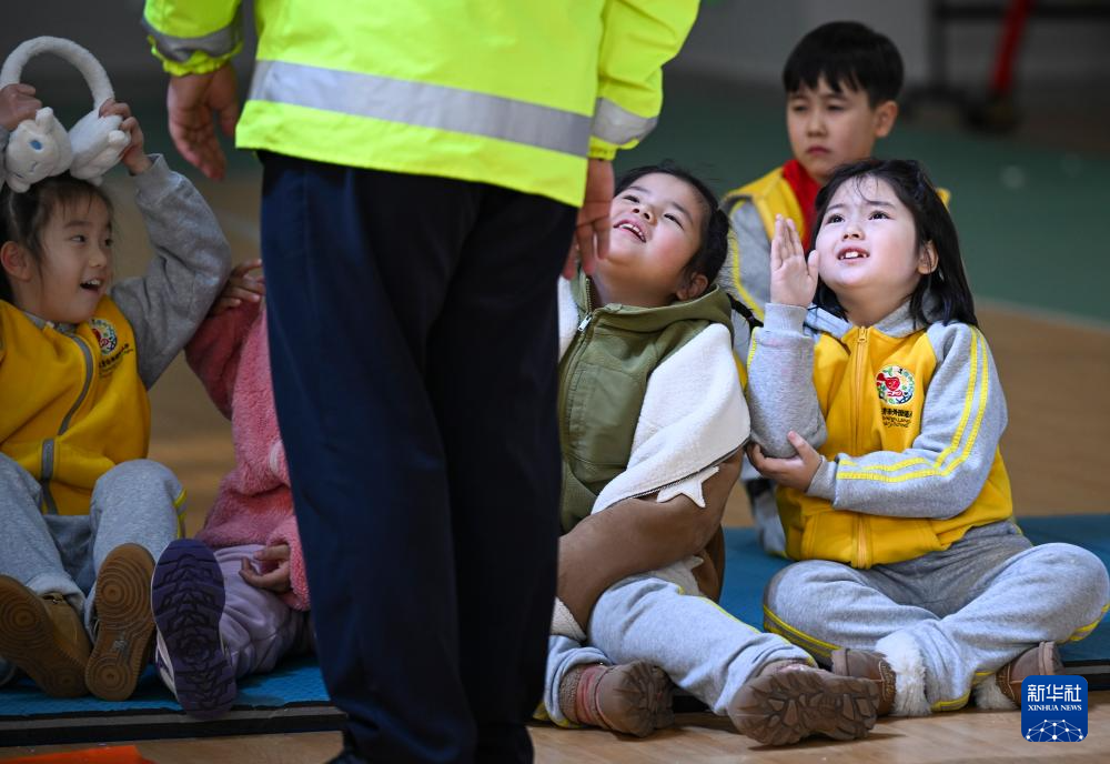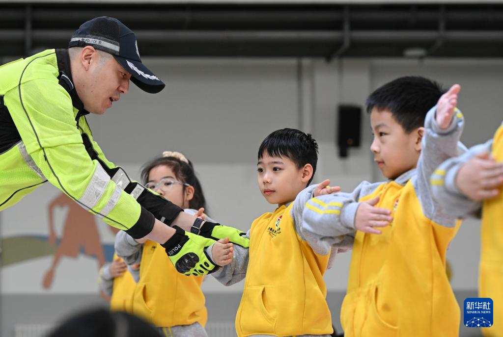 1月23日,在乌鲁木齐市第152小学,学生学习交通指挥手势。新华社记者 王菲 摄