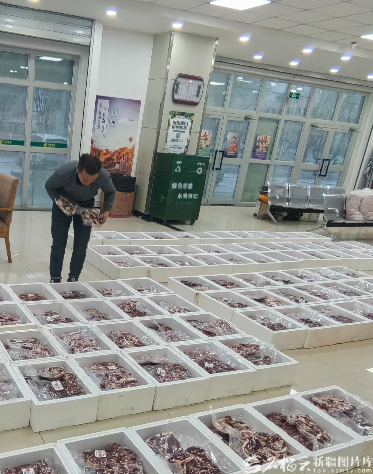 1月5日,在乌恰县邮政分公司,真空包装的柯尔克孜羊肉经过工作人员分批打包,将发往全国各地。王靖斌摄