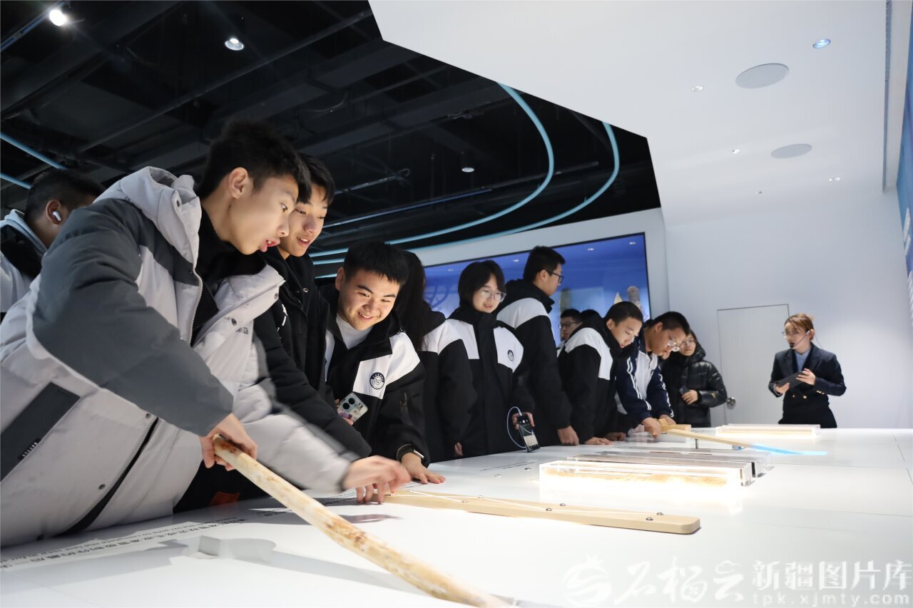 在阿勒泰人类滑雪起源地博物馆内,学生们在讲解员的带领下,体验古老毛皮滑雪板制作。吾丽帕·吾拉勒别克 摄