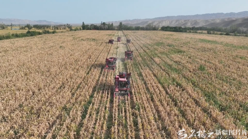 2025年9月末,玛纳斯县包家店镇的制种玉米地里,农机来回穿梭收割玉米,一派丰收的繁忙景象(资料图)。玛纳斯县融媒体中心供图