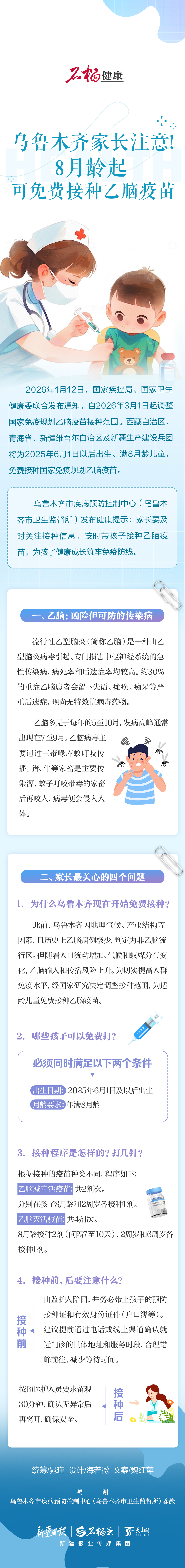 乌鲁木齐市疾病预防控制中心(乌鲁木齐市卫生监督所)发布健康提示:家长要及时关注接种信息,按时带孩子接种乙脑疫苗,为孩子健康成长筑牢免疫防线。