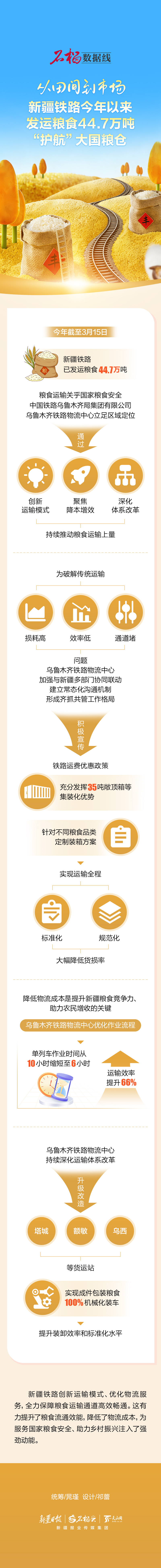 今年截至3月15日,新疆铁路已发运粮食44.7万吨。新疆铁路创新运输模式、优化物流服务,全力保障粮食运输通道高效畅通。这有力提升了粮食流通效能,降低了物流成本,为服务国家粮食安全、助力乡村振兴注入了强劲动能。