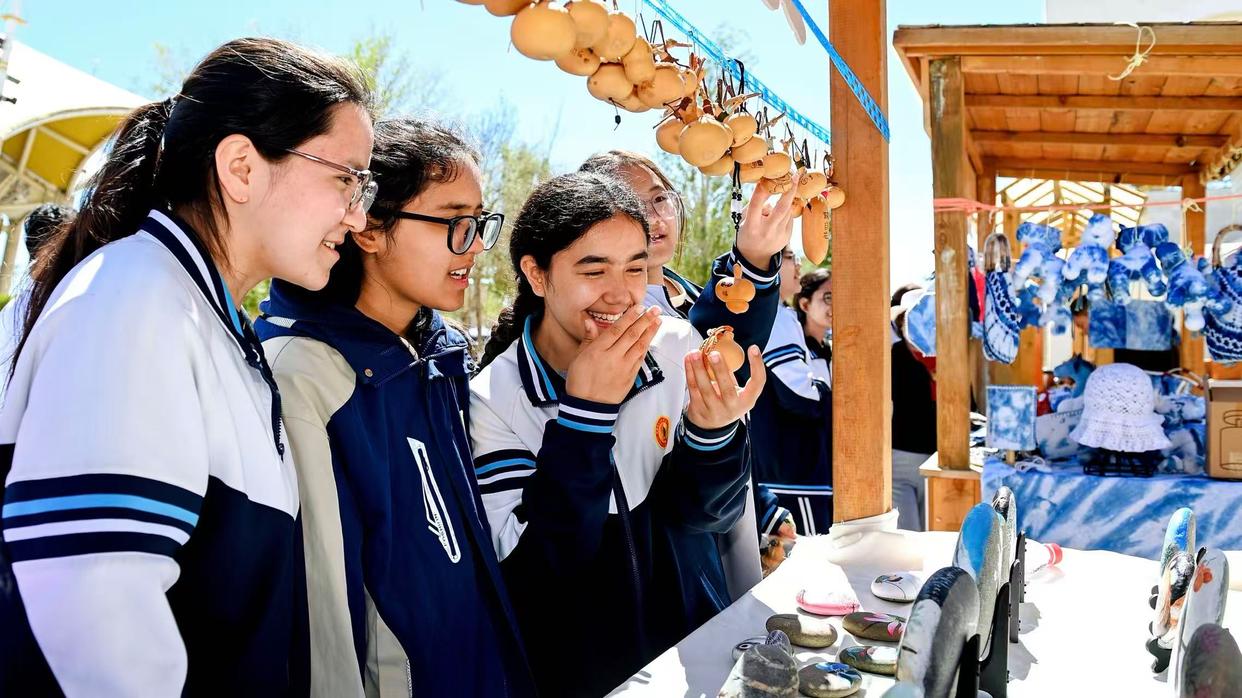 在新疆特种旅游节“荒野市集”上,参加研学的学生正在选购特色非遗文创产品。努尔夏提·尼加提 摄