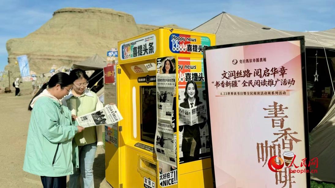 活动由克拉玛依市人民政府主办,克拉玛依市文化体育广播电视和旅游局、乌尔禾区人民政府承办。 游客在“书香旅行”帐篷区翻阅本土作家作品,并自拍留念。人民网 李龙摄