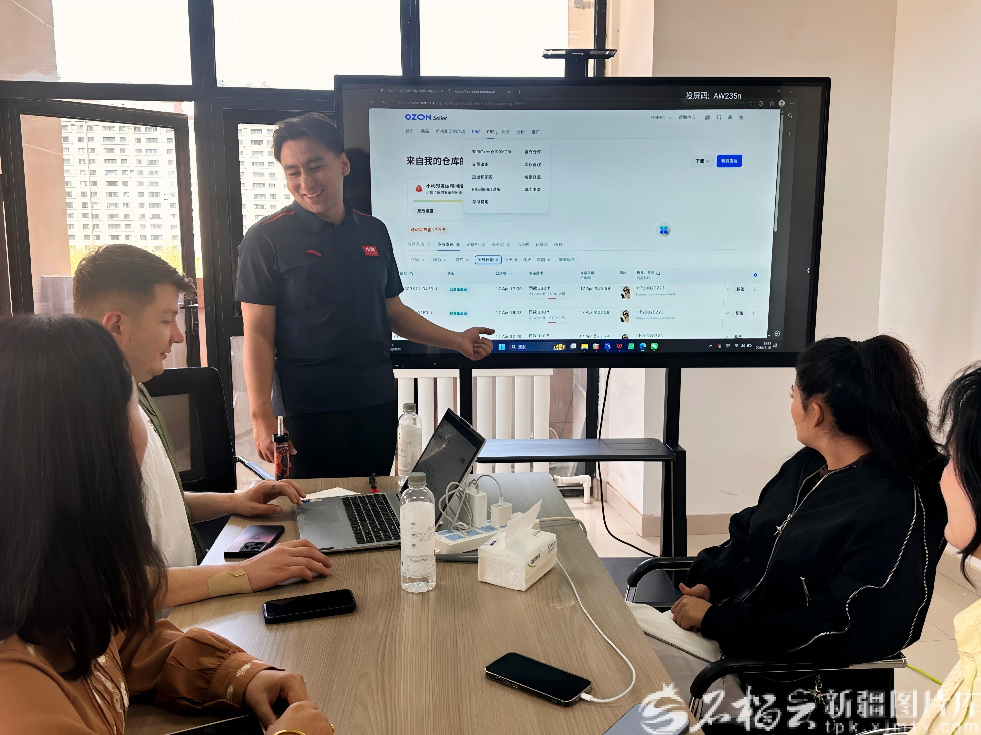 满苏尔·阿布都拉在和公司员工讨论业务。本人供图