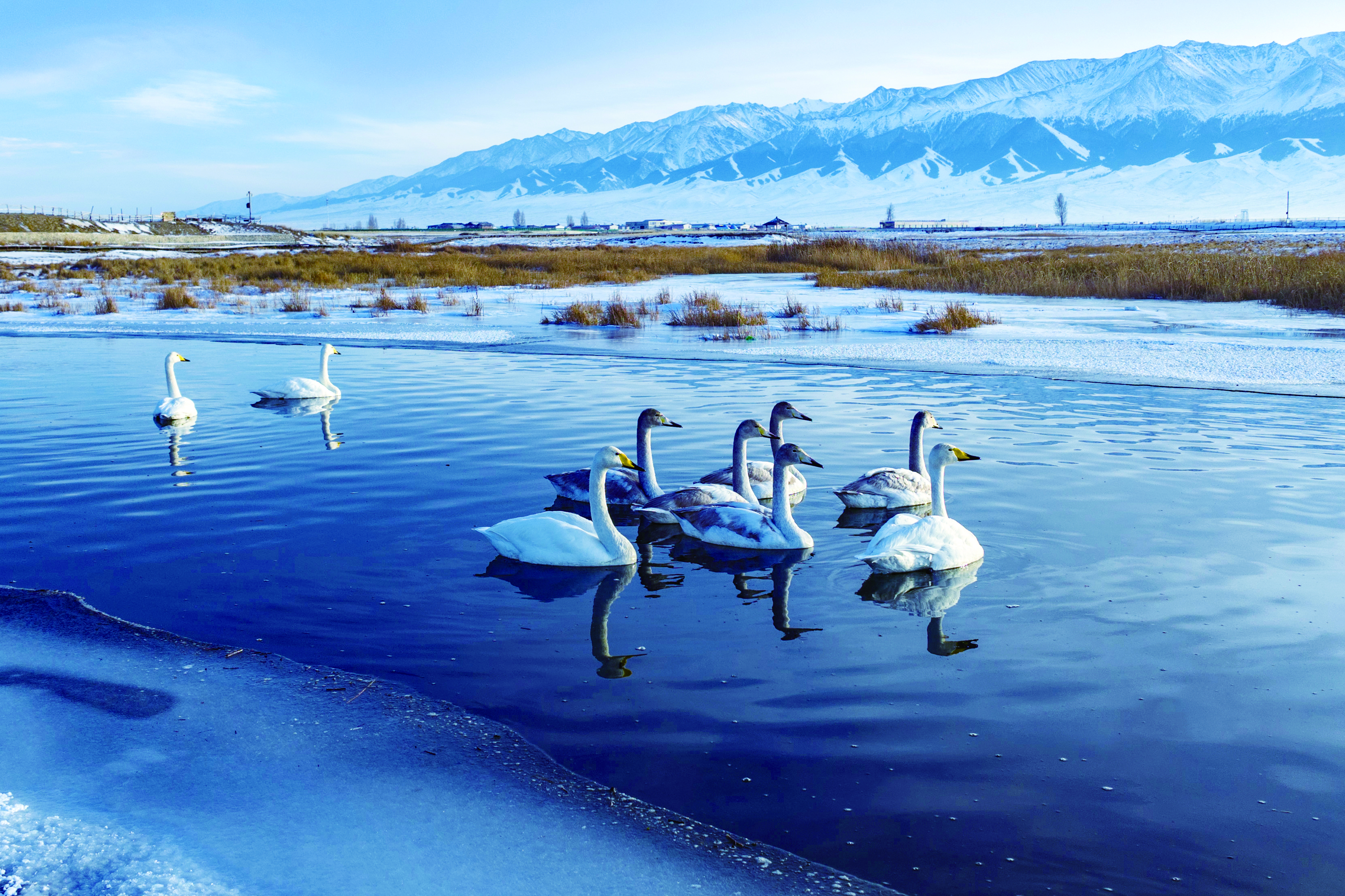 在巴里坤哈萨克自治县高家湖湿地景区,天鹅在水中游弋。钟卫亮/摄