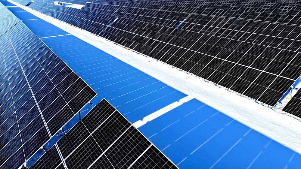 1月24日,新疆昌吉回族自治州木垒哈萨克自治县,光伏产业园犹如茫茫雪原上的蔚蓝大海,冰雪铺展如素笺、光伏板列阵似铠甲,阳光倾洒,板面熠熠生辉。光电在无声中转换,电流在寂静中奔涌,为这片荒原注入无限生机。