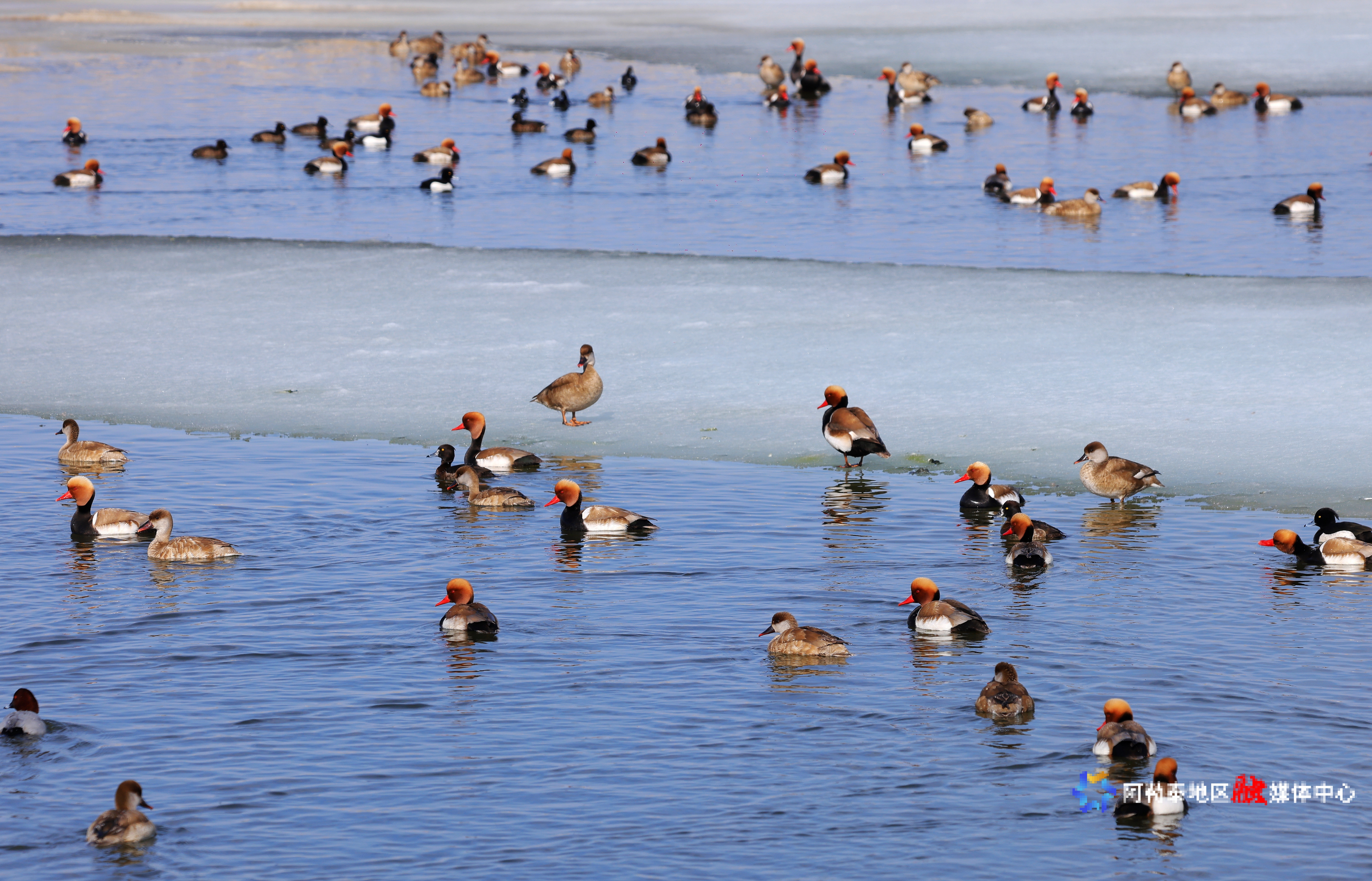 3月23日,成群的赤嘴潜鸭等候鸟在乌伦古湖国家湿地公园栖息。