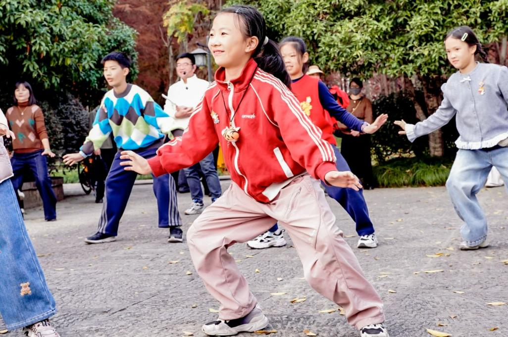 孩子们刚踏入红杉林,便看见村民韩华方正舞动着太极刀锻炼,刀光在杉影间流转,划出灵动的弧线,铿锵之声在林间回荡。伴随着阵阵喝彩声,韩师傅带领着孩子们练起了杨氏太极拳,一招一式沉稳舒展,大家在美景中沉浸式感受了中华传统武术的独特韵味。