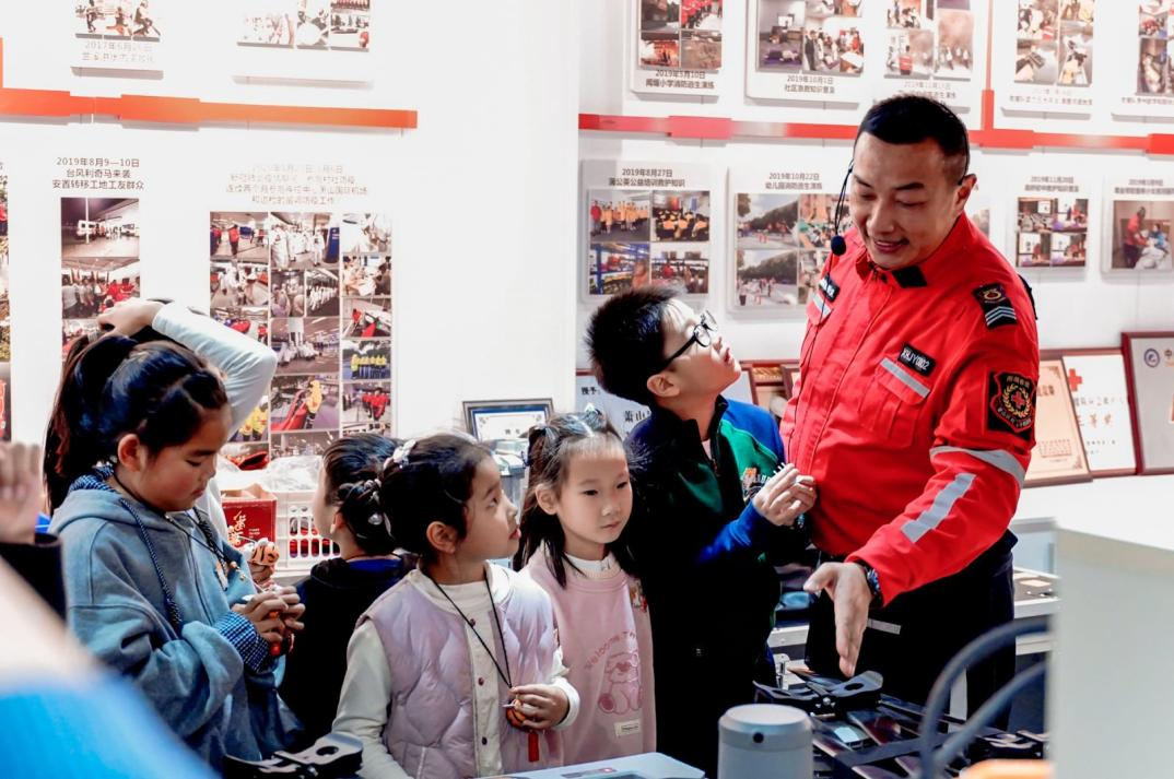 在救援工作室,李队长一边展示着破拆工具、急救包、救援器械,一边讲述一个个惊心动魄的救援故事。从马蜂窝到高层失火,从交通事故到塌方救援,现场气氛热烈,研学队员时不时发出一阵阵惊叹和欢呼声。俞红刚趁机提问:“如果食物卡进气管里,该怎么办?”孩子们纷纷抢答:“小一点的就咳嗽!”“硬币大小要用海姆立克急救法”“小朋友要拍他的背!”,一声声稚嫩的回答声中,满是坚定与果敢。