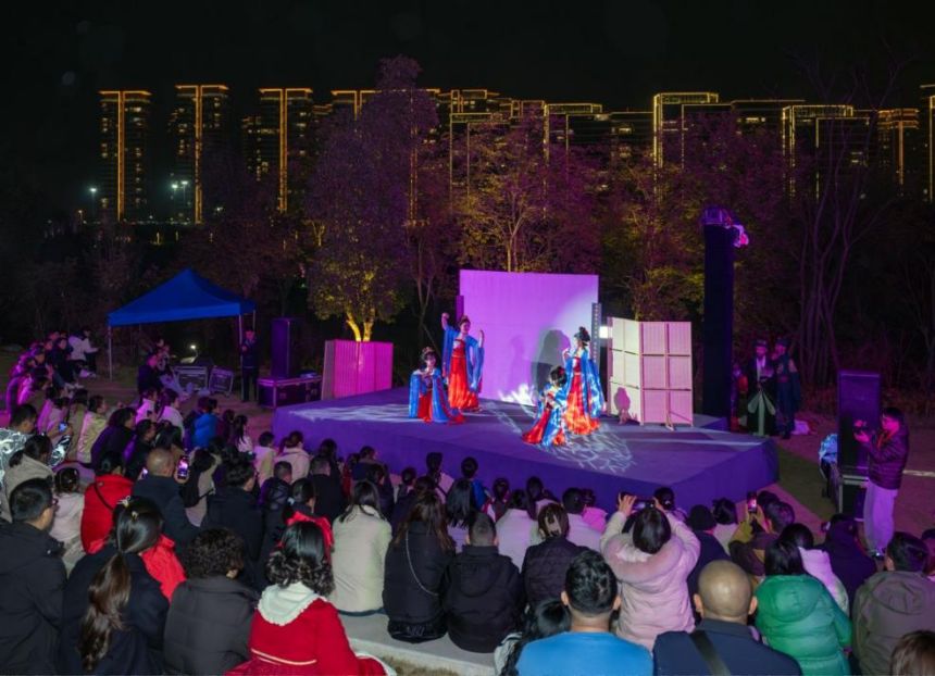 随机上演的快闪表演更添惊喜,演员从人群中、灯组旁踏歌而来,活力满满的舞蹈瞬间点燃现场氛围,游客们不自觉跟着拍手合唱,欢声笑语在湖岛之上回荡。