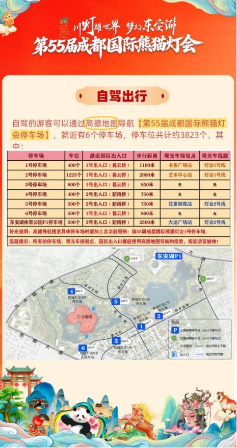 为方便广大市民游客顺畅前往赏灯,本次灯会出行首推公共交通,大家可乘坐地铁2号线至洪河站、13号线至龙安站、30号线至龙泉驿火车南站,出站后换乘灯会专属免费接驳车,即可直达园区;若选择自驾前往,可直接导航搜索“第55届成都国际熊猫灯会1号/2号/3号/4号/5号/6号停车场”,距离1号入口最近的是6号、3号停车场,距离2号入口最近的是4号、5号停车场。现场不仅车位充足,还有工作人员专人引导停车,让大家的赏灯之行便捷又省心。