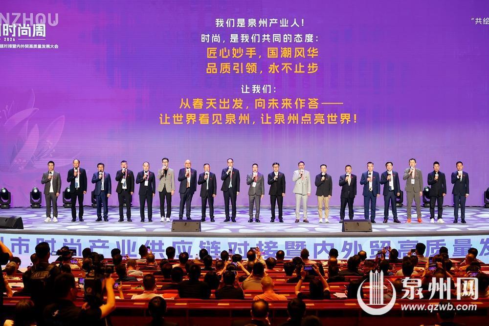 大会最后,20位企业家代表共同登台,发出“共绘蓝图 时尚接力”倡议。大家郑重承诺,将传承弘扬“晋江经验”,坚守实业、深耕主业,敢闯敢试、创新突破,以时尚为引领、以实干显担当,政企同心、接力奋进,为爱拼敢赢的泉州精神续写新的时代荣光。