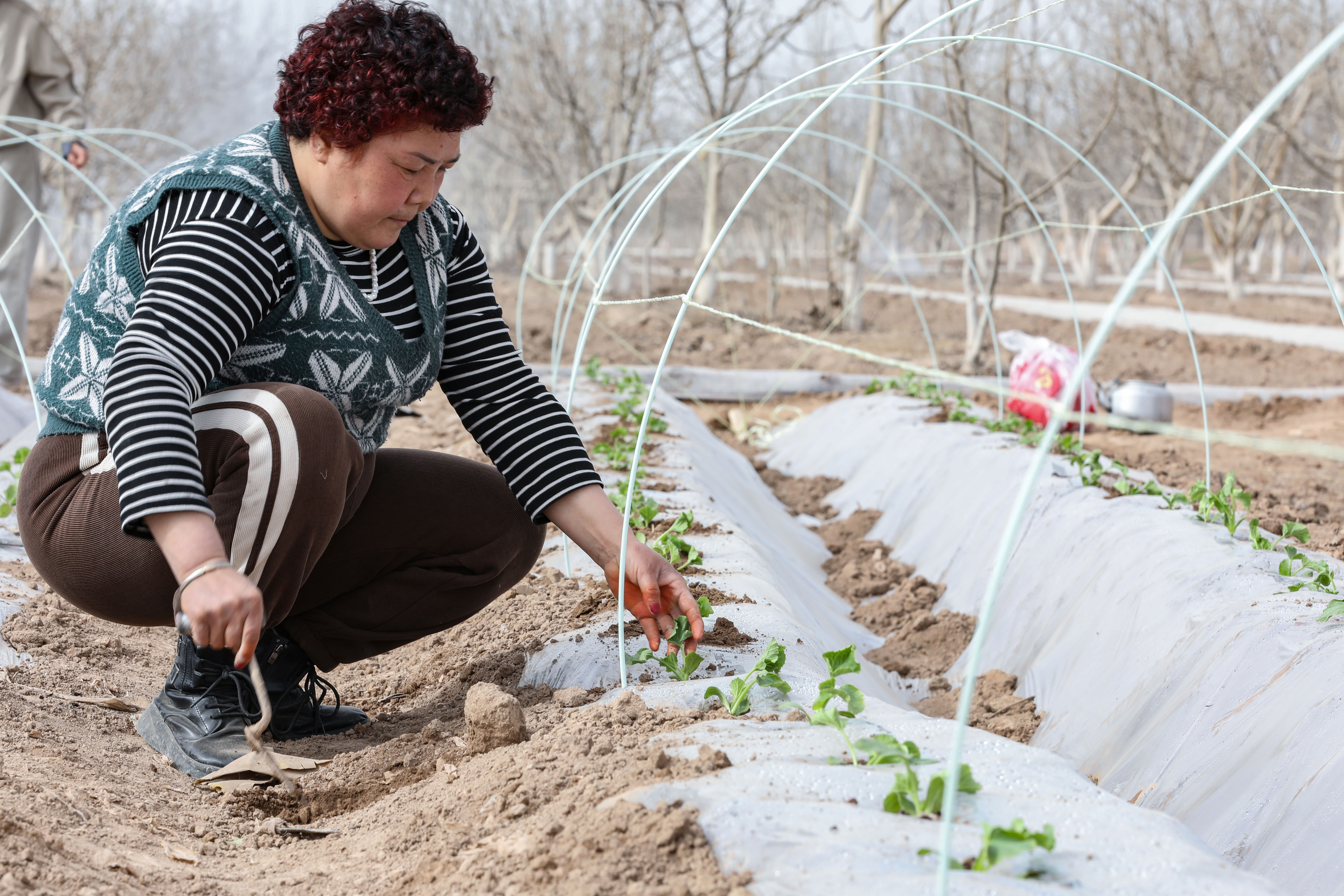 ▲库车市乌恰镇吐孜鲁克墩村村民抢抓农时,移栽“甬甜5号”瓜苗。卜登鹏 摄