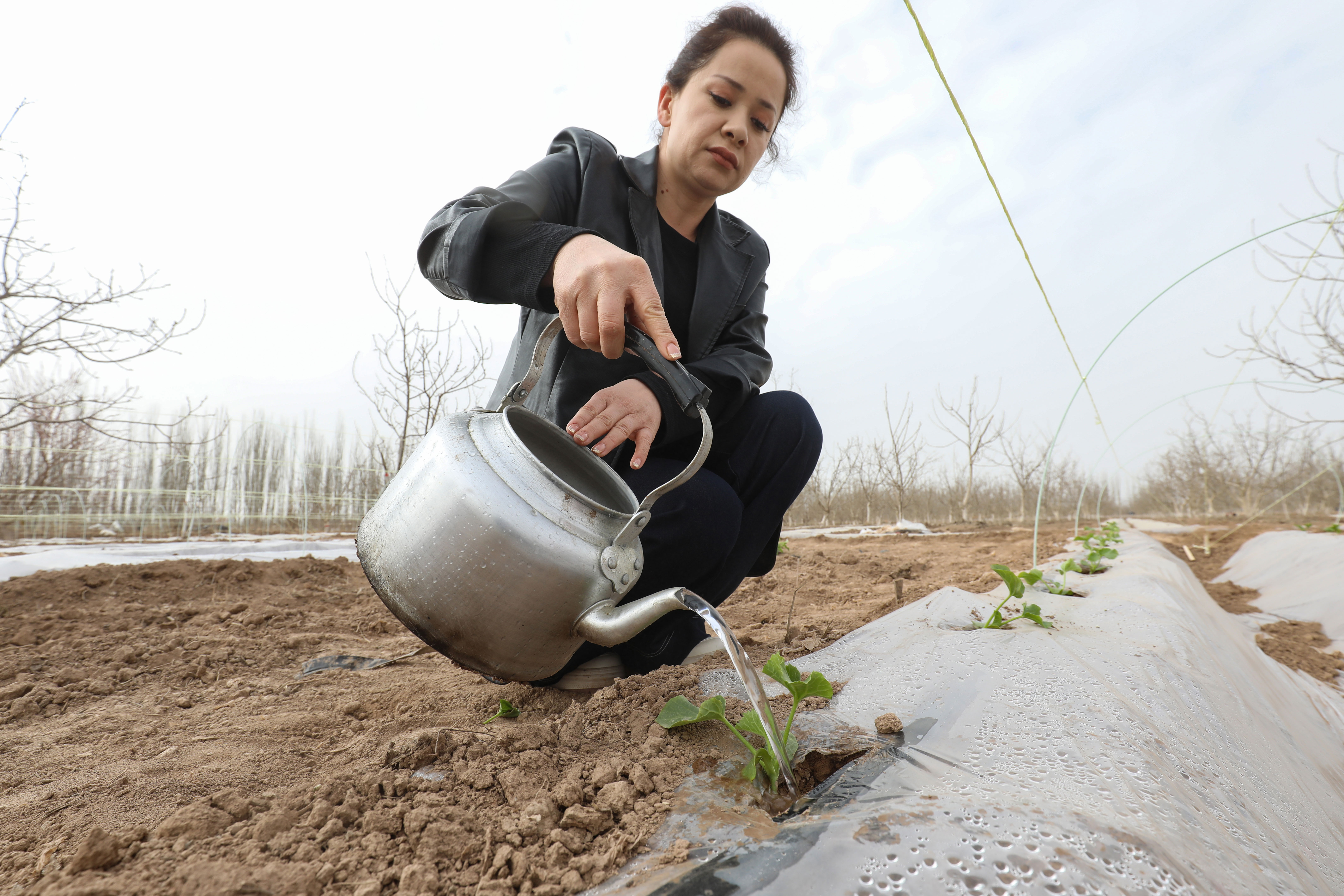 库车市乌恰镇吐孜鲁克墩村村民为刚移栽的“甬甜5号”瓜苗浇水,助力瓜苗扎根成活。卜登鹏 摄